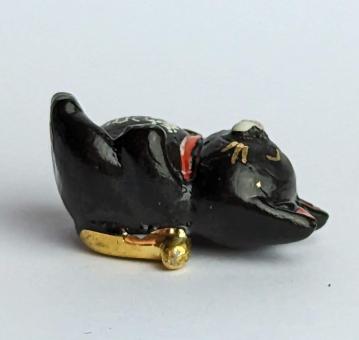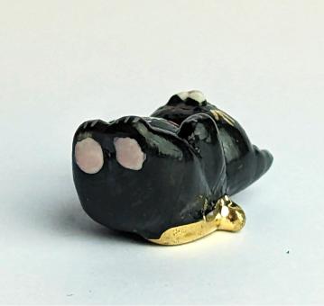 Schwarz, Gold, Weiß und Rot. Diese kunstvoll gestaltete Keramikfigur einer auf dem Rücken liegenden schwarzen Katze mit goldenen Schnurrhaaren und goldenem Schwanz ist ein echter Hingucker für jeden Katzenliebhaber und ein Glücksbringer in einem. Die Figur zeigt die Katze in einer entspannten und lässigen Haltung, was ihr besondere Eleganz verleiht.